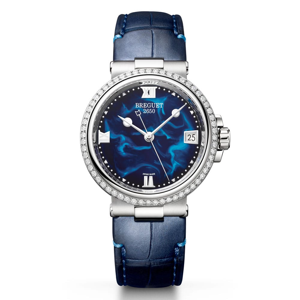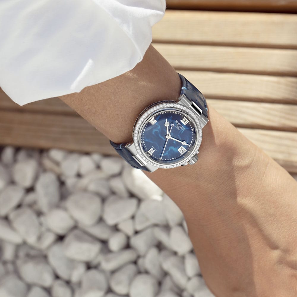 The dial features a blue lacquered finish, providing a dynamic backdrop that captures the essence of the sea. The hour markers are a combination of applied luminous indices and Roman numerals, ensuring readability and elegance. The hands are rhodium-plated gold with luminescent coating, designed in Breguet’s signature faceted “pomme” style.