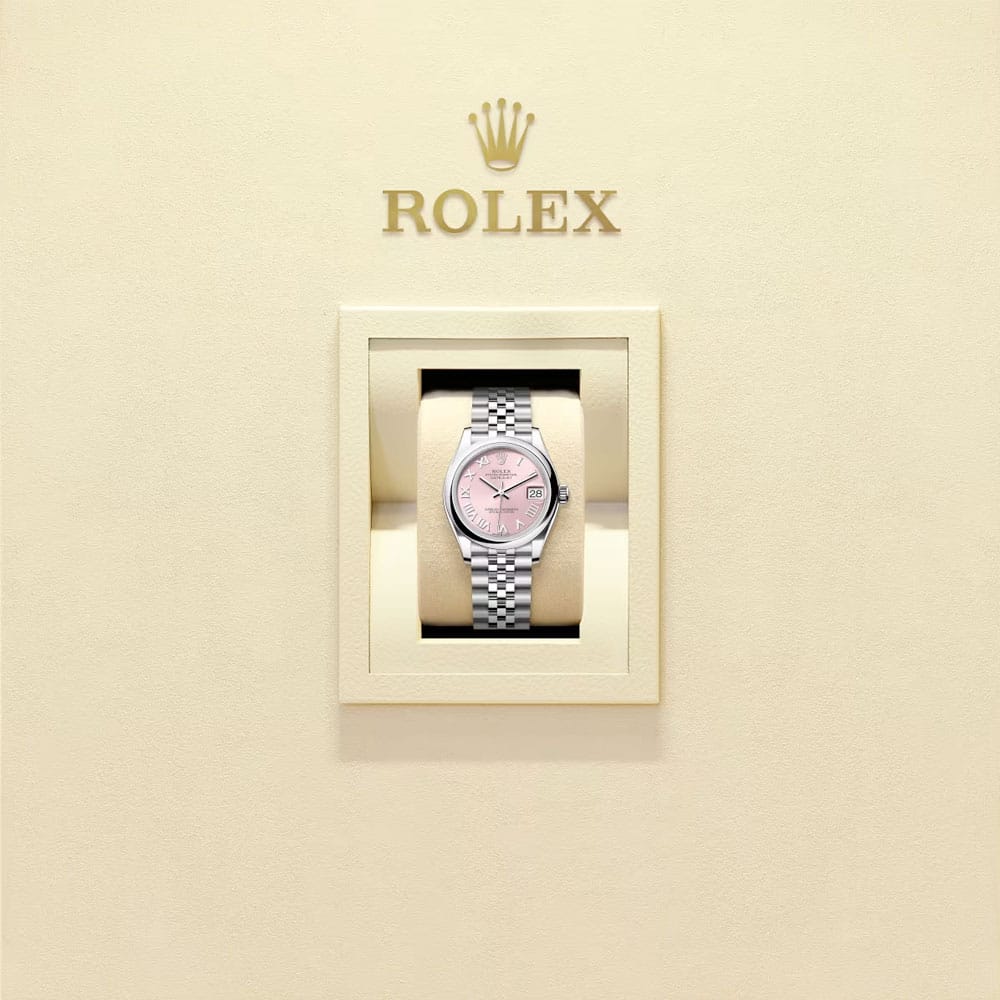 The Rolex Datejust 31 Ref. 278240-0014 is a women’s timepiece that harmonizes classic Rolex DNA with softer design accents and modern performance. Built entirely of Oystersteel with a domed bezel, it features a delicate pink dial and a Jubilee bracelet. With a 31 mm case, robust self-winding movement, and elegant finishes, it’s crafted for wearers who appreciate Rolex precision elegantly scaled.