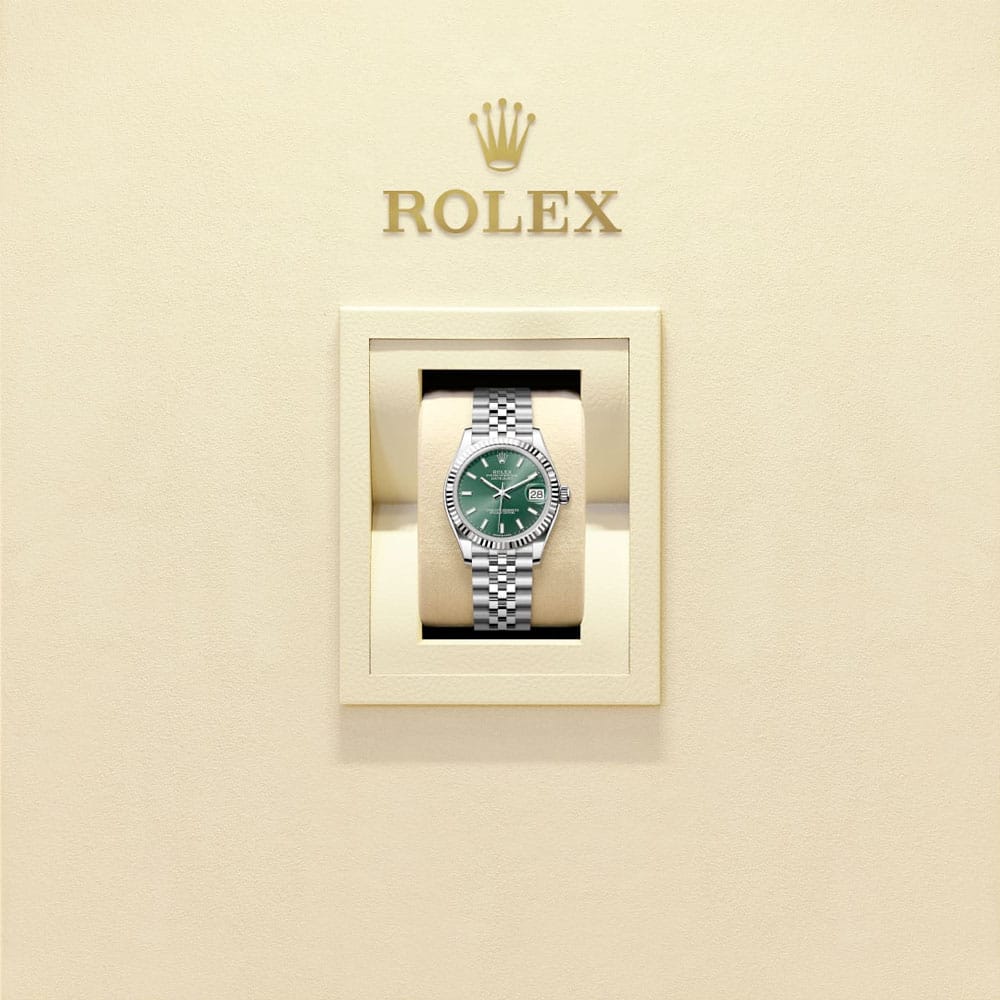 This Datejust features a 31 mm Oyster case crafted from Oystersteel (Rolex’s 904L-grade steel) combined with a fluted white gold bezel, creating the celebrated White Rolesor aesthetic. The fluted bezel, a Rolex signature, was originally functional—to help screw the bezel onto the case for waterproofness—but today is also a hallmark of distinction and style. The Twinlock screw-down crown and a hermetically sealed case back help deliver 100 meters / 330 feet of water resistance.