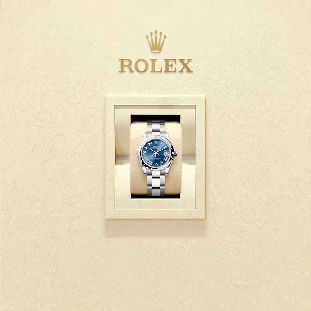 Central to the 278344rbr-0035 is the bright blue sunray dial, with radial brushing that creates a subtle gradient and luminous depth as light shifts. Applied Roman numerals in polished white gold mark the hours, offering classic refinement against the vibrant backdrop. The date is displayed at 3 o’clock and magnified by the Cyclops lens for instant readability. The contrast between the blue dial, luminous numerals, and diamond bezel yields a timepiece that’s both eye-catching and legible.