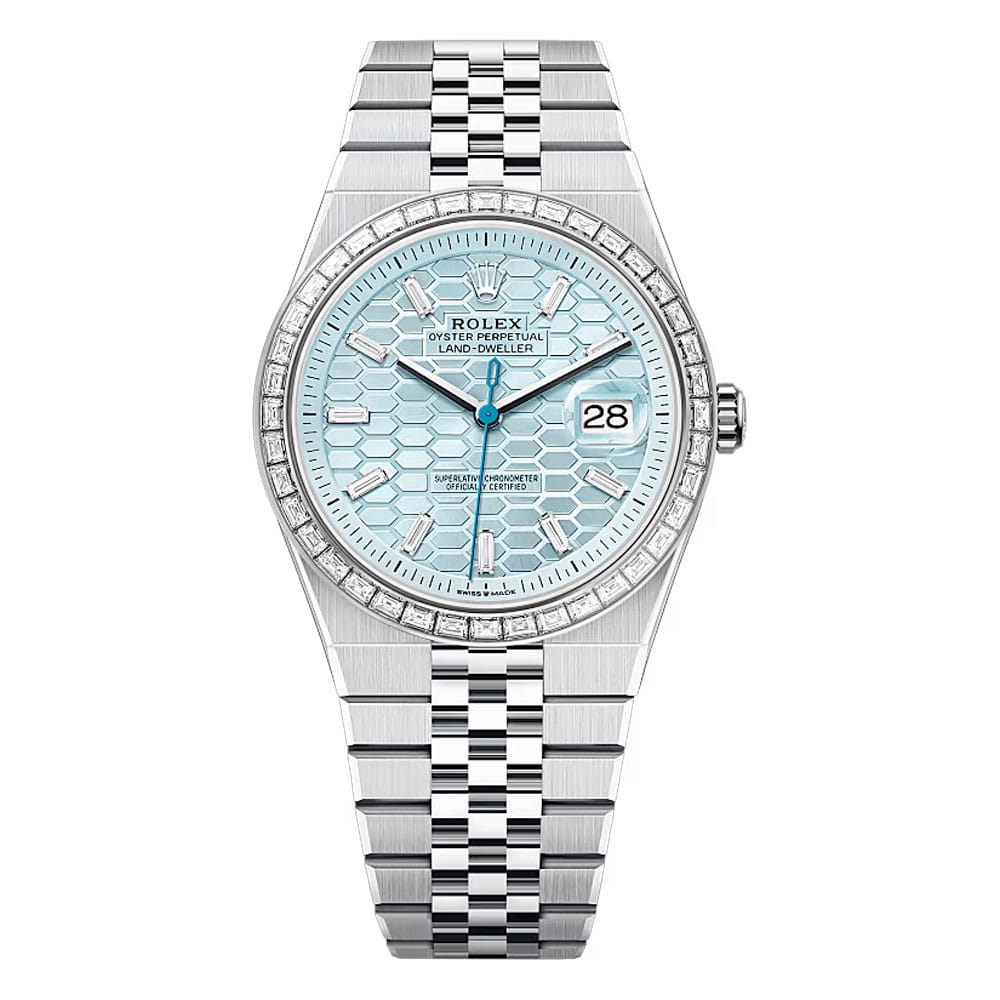 The Rolex Land-Dweller 40 Ref. 127386TBR-0001 is a harmonious blend of timeless design and modern innovation. Its distinctive ice blue dial with honeycomb motif, combined with Rolex’s renowned craftsmanship and technological advancements, makes it a compelling choice for those seeking a watch that embodies both tradition and contemporary flair.