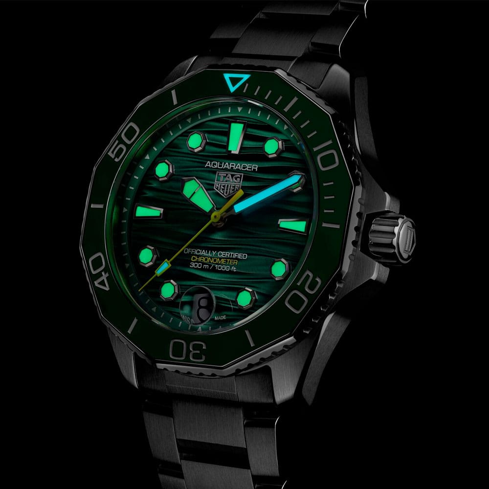 - Dial: Deep green sunray-brushed with wavy pattern, luminescent hands and indexes filled with Super-LumiNova®, vivid lime green seconds hand, date display at 6 o’clock